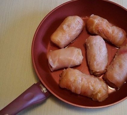 В сковороду выливаем сливки в сковороду, специи, немного растительного масла и пару зубчиков выдавленного чеснока. Добавляем рулетики в сковороду и обжариваем их 10-15 минут.