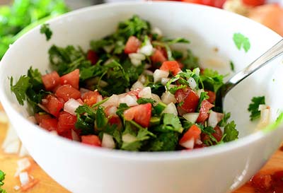 Режем кубиками помидоры, перец, кинзу и добавляем все в миску, приправив соком лайма. Добавим немного сметаны и перемешиваем