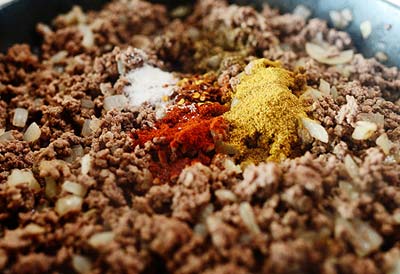 Поджариваем половину луковицы на оливковом масле. Добавляем говяжий фарш. Жарим пока фарш не станет полностью коричневым. Если жира много, то сливаем его. Добавляем к фаршу молотый черный перец, порошок чили, немного тмина и половину чайной ложки соли. Всё тщательно перемешиваем