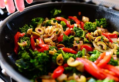 Добавляем в сковороду масло и лук. Жарим на медленом огне пока лук не станет мягким. Режем кубиками отварной или же запеченый картофель, и кладём его в сковороду. Затем добавляем красный перец и оливки (маслины), и тушим на медленном огне