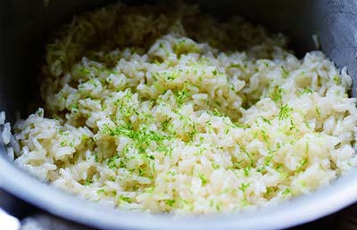 Нагреваем оливковое маслов кастрюле, добавляем рис и перемешиваем постоянно в течении двух минут. Добавляем воду или же куриный бульон, выжимаем сок лайма и также добавляем его перетёртую цедру. Накрываем крышкой и варим в течение 20 минут. После готовности добавляем кинзу и убираем в сторону.