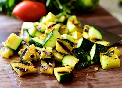 Кабачки режем на несколько частей, берём початок кукурузы, и поджариваем пару минут на мангале или сковороде. Можно вместо кабачков использовать тыкву или дополнить рецепт добавив тыкву. Когда все готово режем кабочки кубиками.