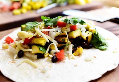 Тортилью предварительно нагреваем в микроволновке, иначе она будет хрупкой. Режем кольцами лук, мелкими долями помидоры и лайм, натираем сыр. На лепешку сначала выкладываем пару ложек риса, потом подмиры, кабачки, зерна поджаренной кукурузы, консервированную фасоль, лук, помидоры, лайм. Кидаем сверху зелень: кинзу или петрушку.