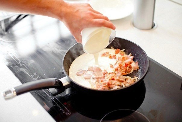 Режем лук полукольцами, обжариваем его вместе с беконом в сковороде на оливковом масле. Вливаем сливки и жарим еще пару минут постоянно помешивая