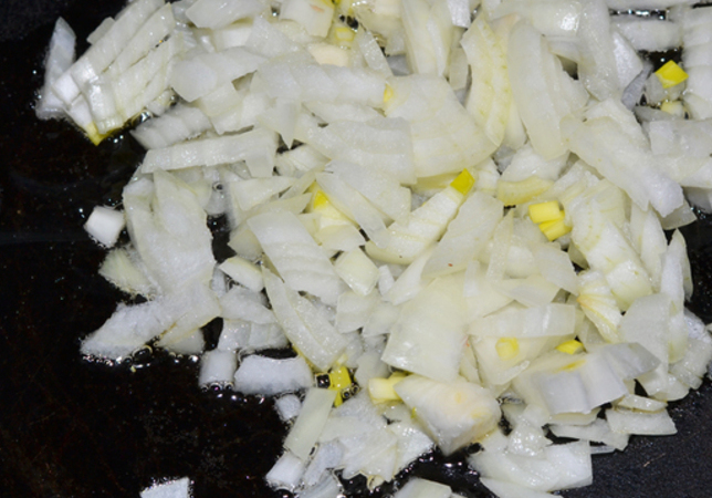 Отвариваем пасту до полуготовности на подсоленной воде. Выкладываем пасту в сите и добавляем ложку оливкового масла. Для приготовления соуса обжариваем лук на оливковом масле, затем добавляем кабачки. Можно порезать из полукольцами, можно кубиками.