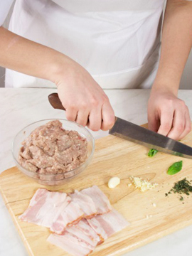 Режем бекон тонкими ломтиками. Добавляем в фарш лук, специи, панировочные сухари, яйцо, сливки, солим и перчим. Хорошенько перемешиваем.