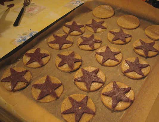 Перемолоть орехи с сахаром. Добавить сливочное масло, яйцо, немного соли и разведённые в молоке дрожжи. Засыпать просеянную муку и замешиваем тесто. Тесто закрыть полиэтиленом, убрать в холодильник минут на 10. Затем достать, отделить одну треть и перемешать её с какао и тёртым шоколадом. Оба вида теста накрыть полиэтиленом и снова положить в холодильник минут на 20-30. Тесто с какао раскатать и вырезать из него звёздочки. Звёздочки должны быть чуть-чуть меньше по диаметру, чем кружки.