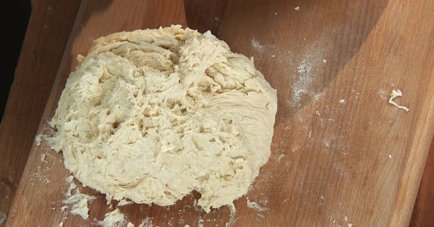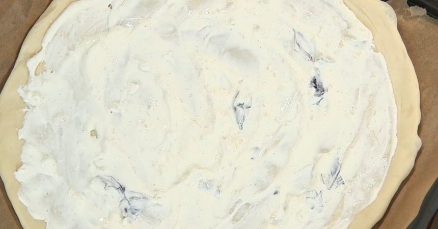 В другой миске готовим соус. Смешиваем специи, оливковое масло и сметану. Раскатываем тесто и смазываем соусом его.