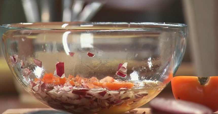 В миску добавляем яйца, мелко порезанный лук, помидоры и болгарский перец. Солим, перчим и перемешиваем все.