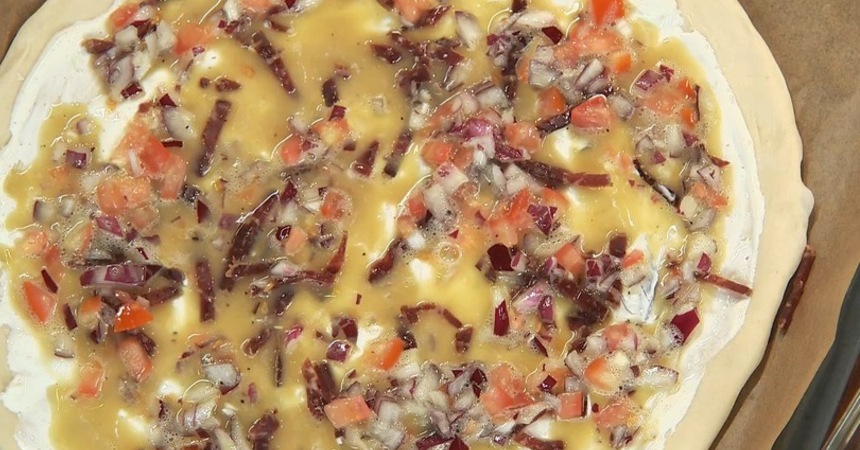 Ветчину нарезаем соломкой и посыпаем ветчину на пиццу, сверху заливаем яичную смесь. Отправляем пиццу в разогретую до 200 °C духовку на 10-15 минут.