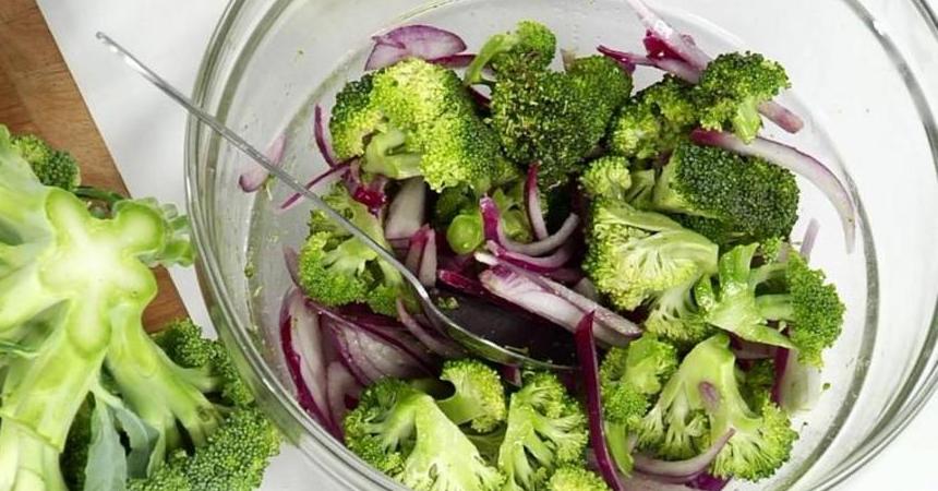 Брокколи разделаем на соцветия, лук шинкует тонкими кольцами. Складываем все в миску и поливаем ложкой оливкового масла. Помидор и болгарский перец мелко режем кольцами.