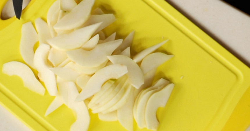 Смешиваем сливочный сыр и сливки для соуса. равномерно покрываем пиццу нашим соусом. Потом кладём дольки груши. Посыпаем пиццу тёртым сыром