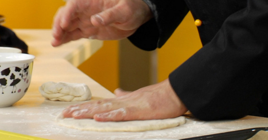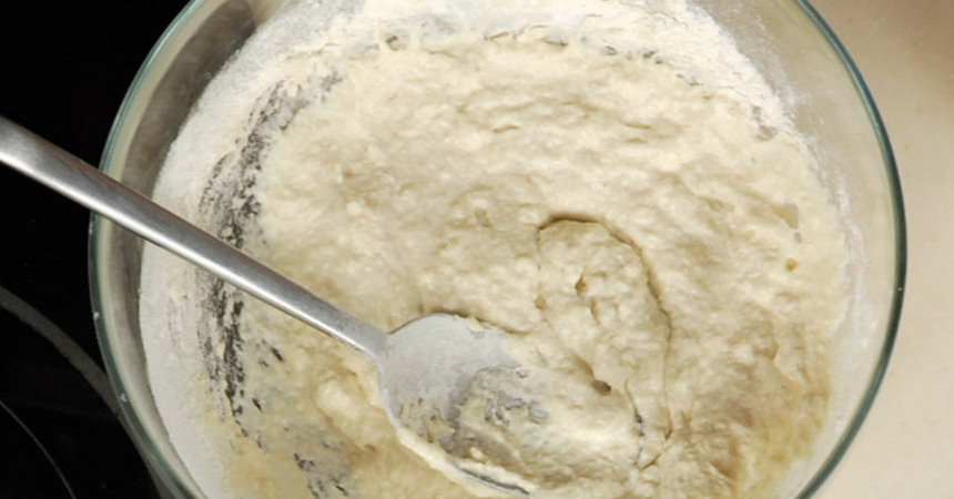 Замешиваем в половине стакане воды дрожжи, соль, немного сахара. Убираем в сторону на 5 минут. Потом замешиваем тесто. Смешиваем манку, муку, дрожжи до равномерной массы и убираем.
