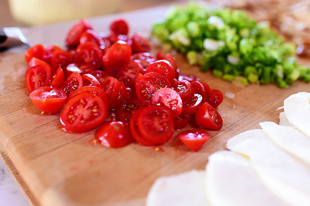 Посыпаем куриные филе солью и перцем. Нагрейте немного оливкового масла на сковороде и обжариваем филе с обеих сторон до готовности. Около 3-5 минут с каждой стороны, в зависимости от толщины. Дать немного остыть, затем нарезать на тонкие кусочки.