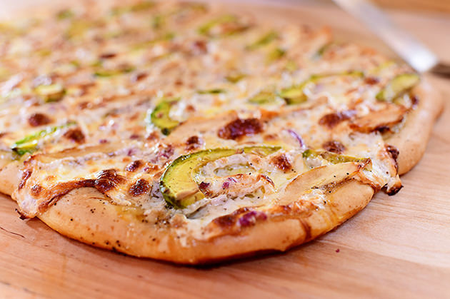 Нарезаем лук, сыр и авокадо дольками. Раскатываем тесто и смачиваем слегка оливковым маслом, выкладываем сыр, авокадо, курицу и лук на тесто. Слегка посыпаем солью и перцем и отправляем в разогретую до 250 °C градусов духовку на 10-15 минут