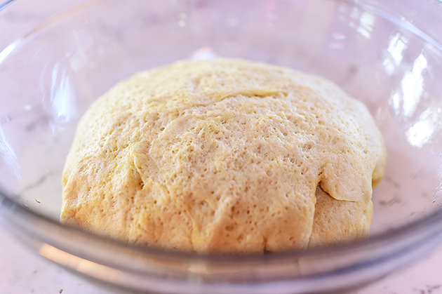 Засыпаем дрожжи в стакан с тёплой водой. Затем смешиваем муку с солью и оливковым маслом, потом добавляем дрожжи и перемешиваем до однородной консистенции. Убираем тесто на 1-2 часа. Тесто лучше приготовить заранее.