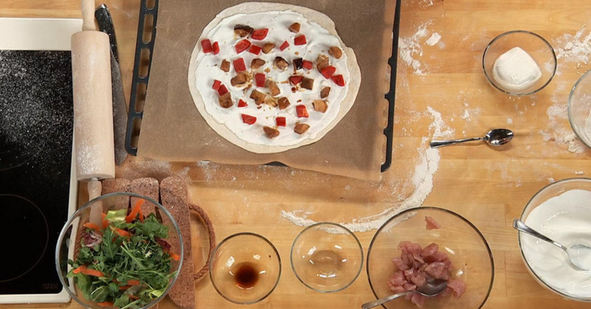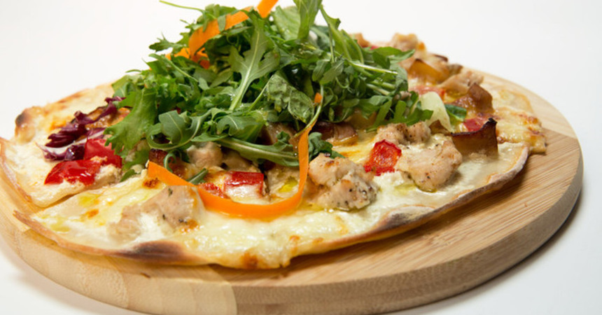 Раскатываем тесто и смазываем его соусом. Сверху кладём филе курицы, болгарский перец, грибы. Посыпаем тертым сыром и зеленью.