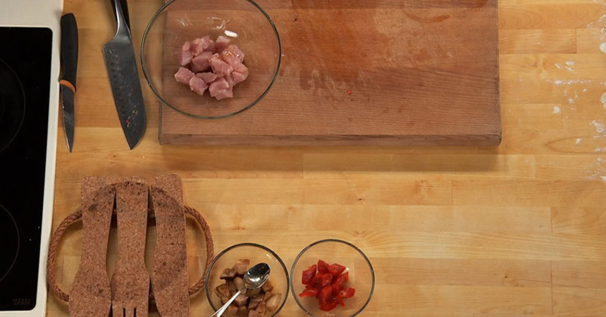 Для приготовления соуса смешиваем сметану, раздавленный зубчик чеснока, специи, соевый соус. Нарезаем филе курицы и грибы соломкой, болгарский перец маленькими кубиками.