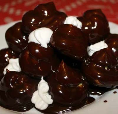 Готовые профитроли должны быть полыми внутри, поэтому делаем небольшое отвествие внизу и заливаем взбитые сливки внутрь.