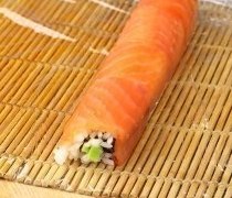 Плотно сворачиваем роллы, филе рыбы окажется снаружи. Даем настояться в холодильнике минут 10 и можно разрезать.