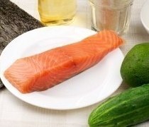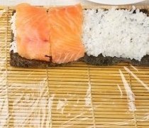 На половину листа водорослей нори ровным слоем выкладываем рис, потом выкладываем филе лосося. Лист предварительно слегка смачиваем водой, в которую добавили 2 чайных ложки уксуса