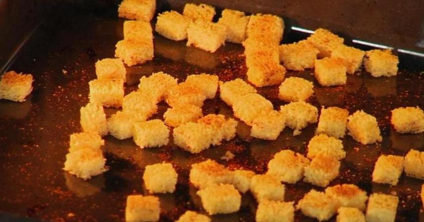 Хлеб для тостов нарезаем кубиками и посыпаем паприкой.хлеб вместе с курицей отправляем в разогретую духовку на 5-7 минут.