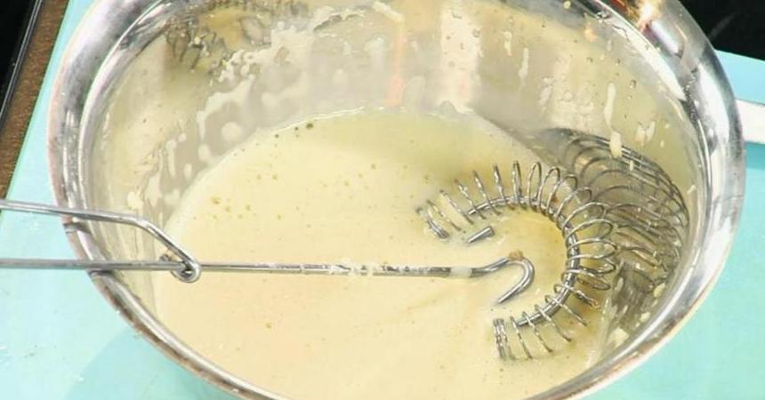 Отделяем желток от белка. Желток взбиваем вместе с соком лимона и оливковым маслом. Добавляем мелко порезанные анчоусы и продолжаем взбивать. После добавляем немного тёртого сыра пармезан и чеснок.