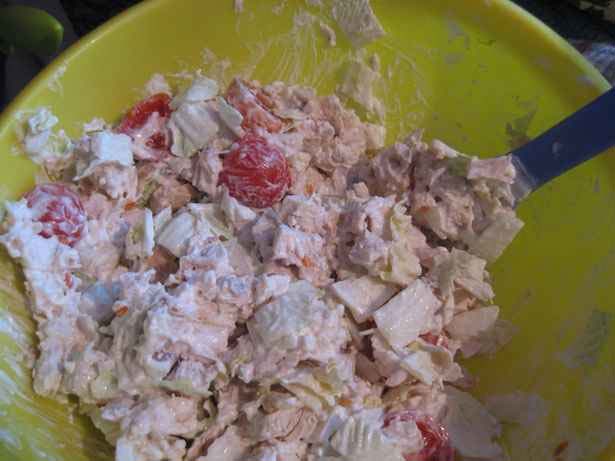 Добавляем в салат курицу, сухарики, помидоры, капусту и пару зубчиков мелко нарезанного чеснока для вкуса. Заливаем майонезом и перемешиваем