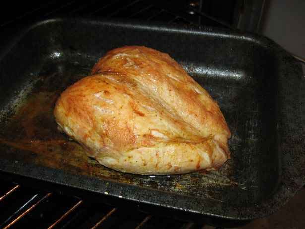 Сначала нужно приготовить курочку. Для этого её посыпаем приправой и запекаем в духовке до готовности (30-40 минут)