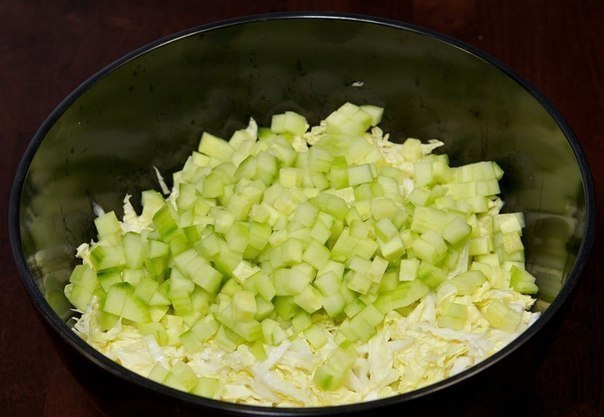 Ставим яйца вариться, тем временем мелко режем пекинскую капусту, с огурца снимаем кожуру и нарезаем кубиками. Отправляем все в миску
