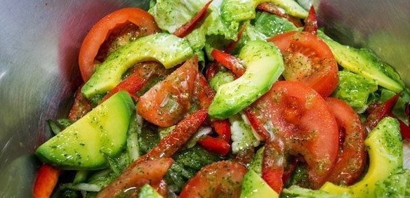 Помидоры нарезаем дольками, салат, огурец и перец соломкой, предварительно удалив зерна. Авокадо режем небольшими дольками.