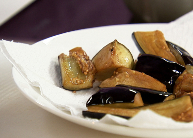 Режем баклажаны и отправляем их в миску с водой на 10 минут, потом обжариваем на сковороде пару минут пока не подрумянится.
