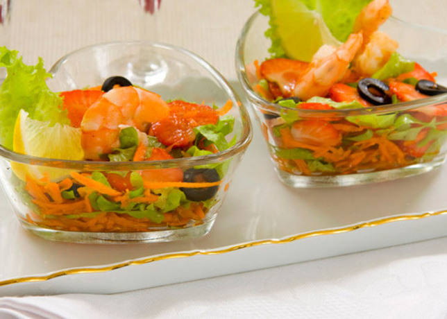 Нарезаем клубнику небольшими кусочками, морковь натираем на тёрке, сыр режем небольшими кубиками. Отвариваем креветки. Соединяем все ингредиенты и заправляем мёдом, соком лимона и уксусом. Слегка солим и перемешиваем, украшаем зеленью.