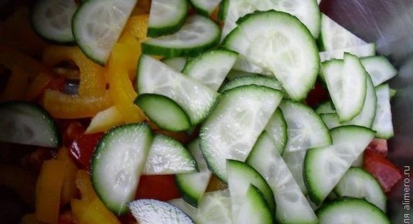 Нарезаем соломкой, помидоры и огурцы полукольцами, маслины режем колечками. Сыр Фета режем маленькими кубиками
