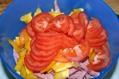 Нарезаем соломкой сыр и ветчину. Из сыров лучше всего выбрать твёрдые сорта. Нарезаем кружками сладкий перец и небольшие помидорки.