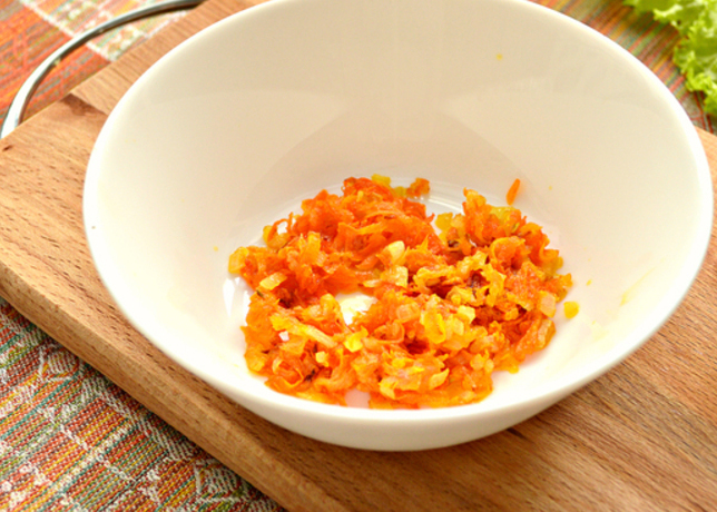 Лук мелко режем кубиками, морковь трем на тёрке и обжариваем все на растительном масле пару периодически помешивая. Перекладываем в миску.
