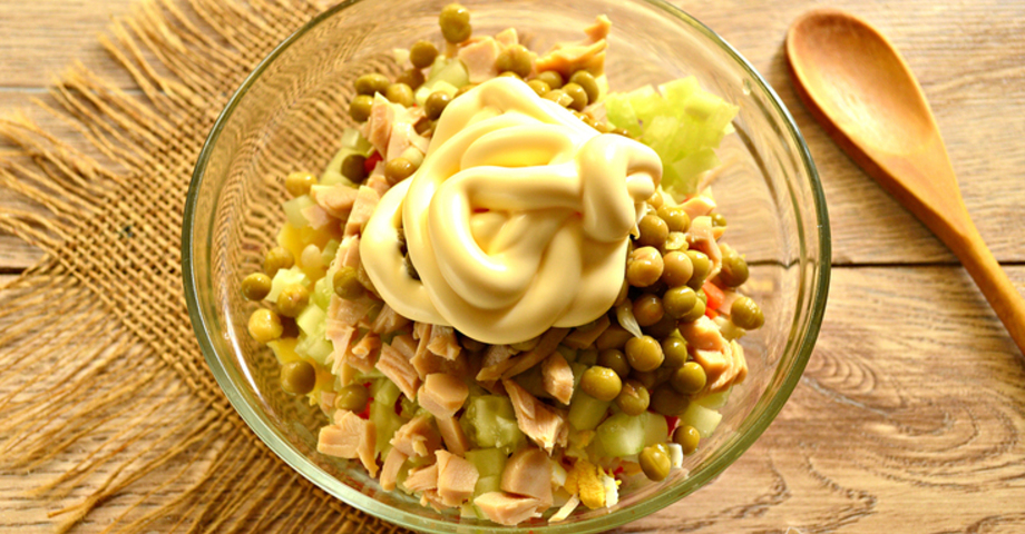 Режем огурец, маринованные шампиньоны, зелень, солим, перчим. Заправляем все майонезом и перемешиваем.