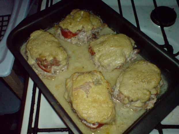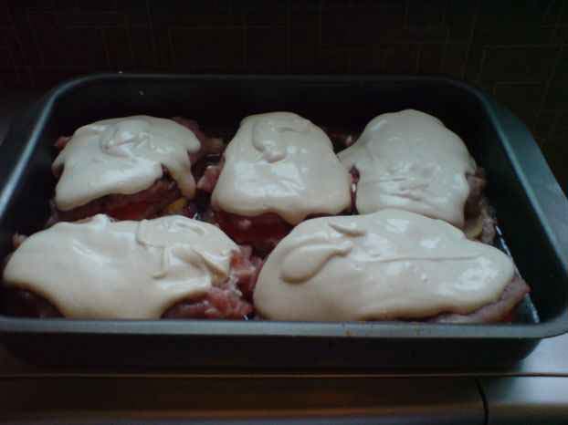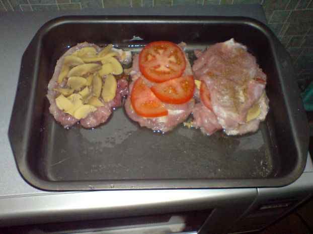 Добавляем в форму немного растительного масла и начинаем укладывать слоями мясо. Сперва кладем мясо, сверху порезанные грибы и помидоры, добавляем немного чеснока для вкуса сверху и накрываем еще одним слоем мяса. Солим и перчим мясо