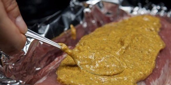 В форму выкладываем фольгу, размазываем по поверхности треть всего соуса и кладем на нее кусок свинины