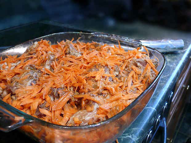 На дно налить немного воды. Запекать в духовке при температуре 250 °C около часа. Периодически подливайте воду, и следите, чтобы блюдо не пригорело".
