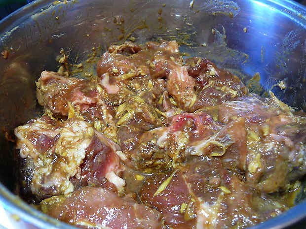 В блюде перемешиваем все перечисленные ингредиенты, кроме моркови Медом натереть каждый кусочек отдельно. Опять хорошенько перемешиваем. Ставим мариноваться в холодное место на пару часов.