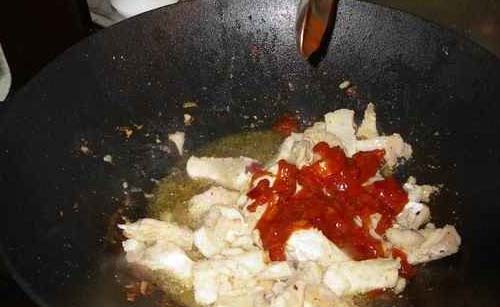 Вынимаем овощи шумовкой и тут же кладем порезанную небольшими кусочками рыбу. Жарим пару минут и добавляем приготовленные заранее томатную пасту, сок лайма, уксус и сахар.