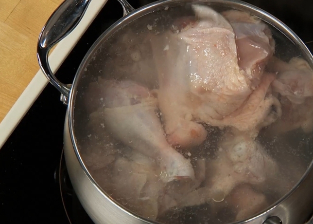 Разделываем тушку курицы на части и ставим вариться примерно на полчаса. Для вкуса и запаха как закипит вода добавляем немного лаврового листа и перца горошком.