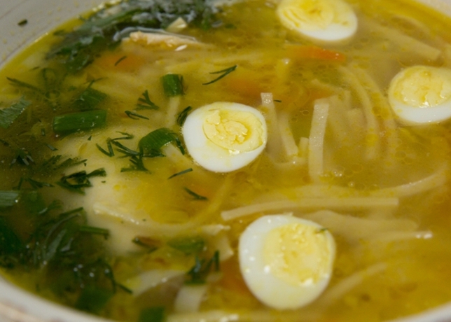 Как только мясо курицы будет готово, вытаскиваем мясо. Добавляем в бульон лапшу, поджарку и варим 5 минут до готовности лапши. При подаче ко столу добавляем в тарелку мясо, половинки перепелиных яиц. Украшаем зеленью. Приятного аппетита.