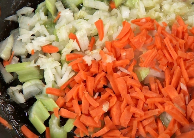 Режем сельдерей, очень мелко шинкуем лук и нарезаем морковку небольшими полосками. Обжариваем овощи на растительном масле 5-7 минут. В небольшой кастрюльке отвариваем перепелиные яйца.