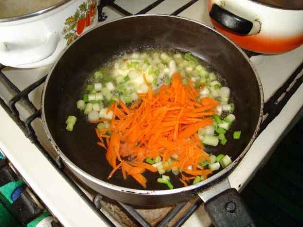 Ставиться кипятиться кастрюлю с водой. А тем временем нарезаем зеленый лук, морковку натираем соломкой. Лук и морковку обжариваем на сливочном масле.