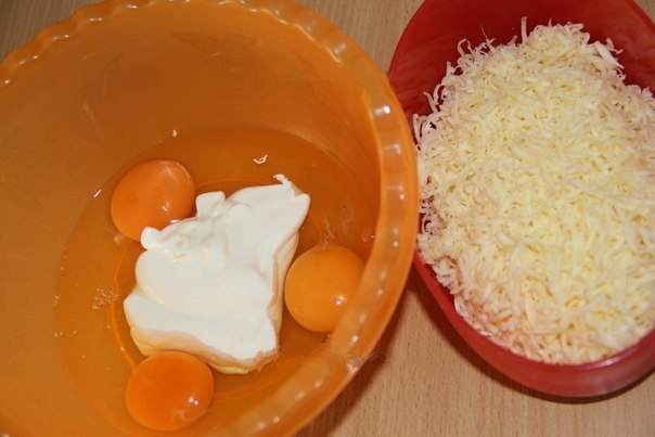 В миску разбиваем яйца, добавляем сметану, сыр натираем на мелкой тёрке и добавляем в миску. Перемешиваем до однородной массы.
