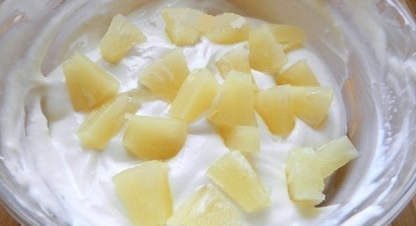 В творожную массу добавляем молоко с желатином и ананас, хорошо перемешиваем и выливаем в форму. Оставляем на несколько часов застывать в холодильнике.