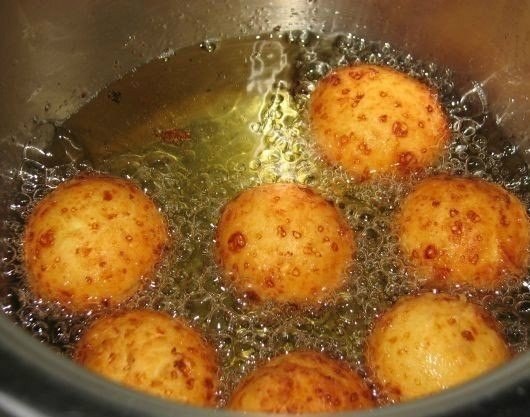 В кастрюлю наливаем побольше растительного масла и нагреваем на небольшом огне. Мокрыми руками формируем шарики и отправляем их в раскаленное масло, до тех пор пока не подрумянятся.