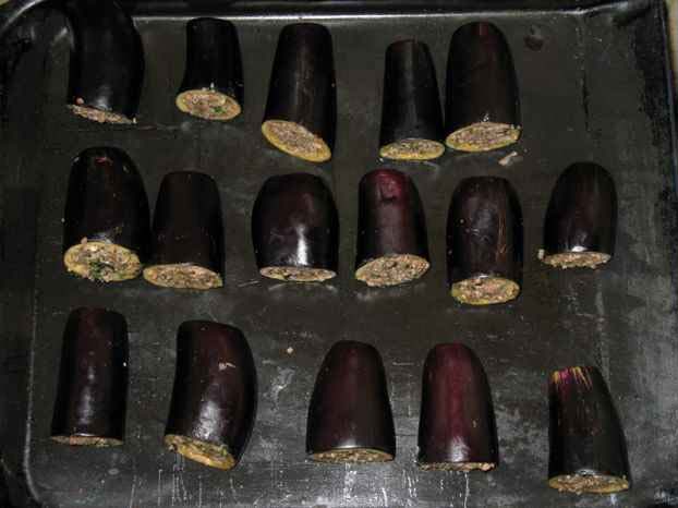 Вырезаем сердцевину из баклажанов и помешаем туда начинку. Фаршированные баклажаны выкладываем на противень